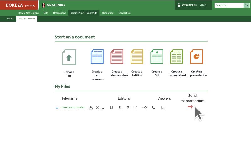3. After you finish writing out your memorandum, it is automatically saved on the platform. You may download the document and keep a copy or send it the Parlaiment by clicking on the Arrow button under Send at the end of the file listing.
