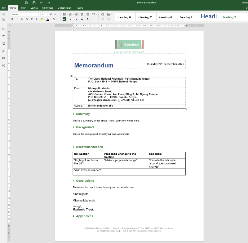 2. A separate browser tab will open with the template containing the required layout for a memorandum that is received by Parliament.