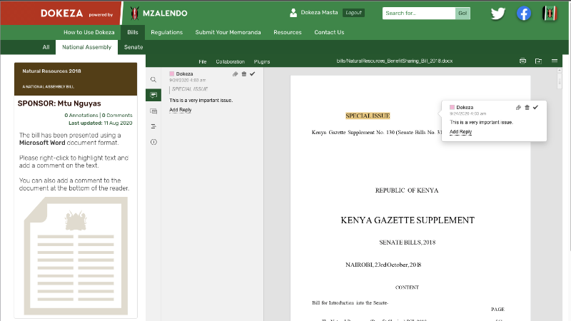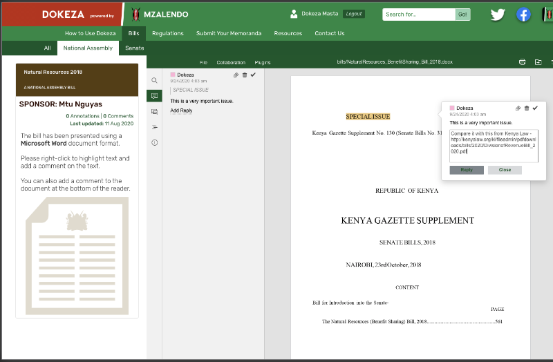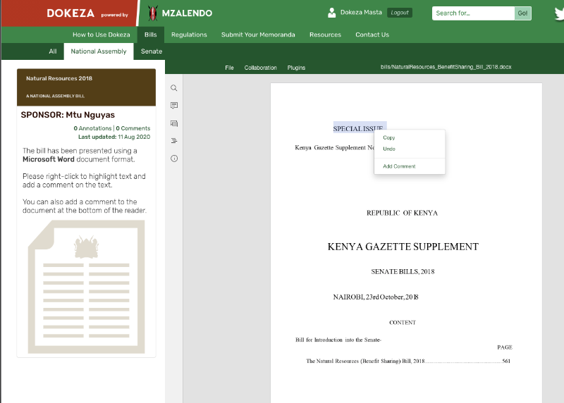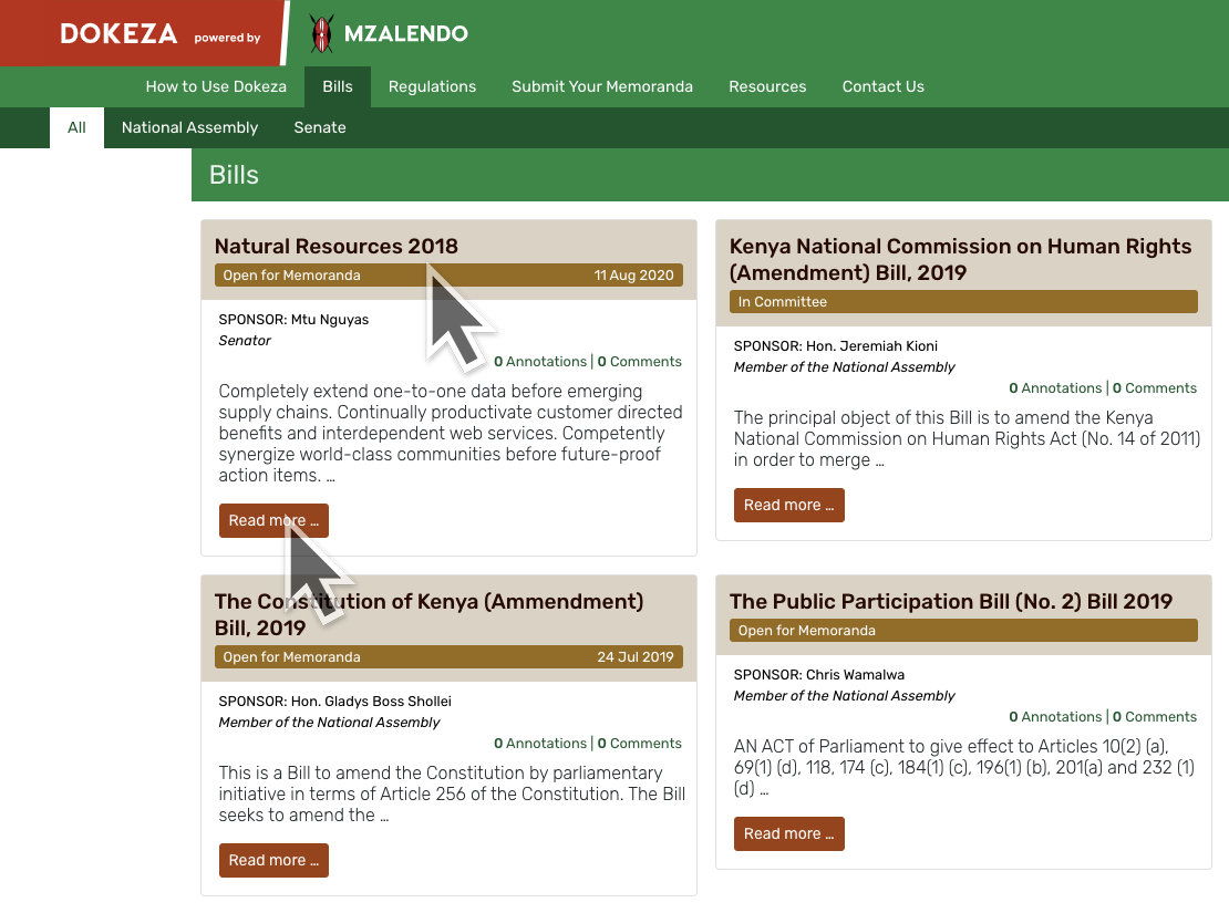 Now that you have clicked on the How to Use Dokeza, Dokeza is a platform by Mzalendo Trust where members of the public can give their opinion on a legislative bill that has been opened to public for particiaption by the two houses of the Parliament of Kenya, the National Assembly and the Senate.