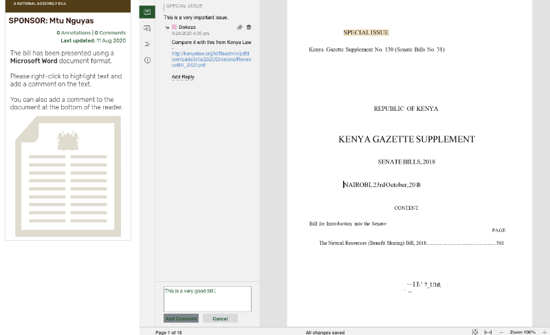 Members of the public can do this by annotating (highlighting text in this case) and comment on the annotation directly on a legislative bill. They can also add links in the replies to aid their explaination. They can also add comments to the entire document if they choose to.